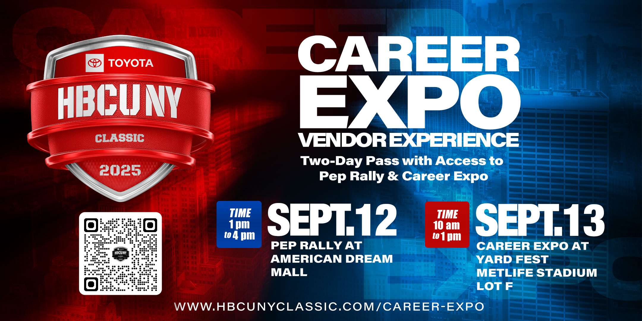 Thank you for your interest in the 2025 Toyota HBCU New York Classic Career Expo Vendor Experience. We are excited to announce this year’s Career Expo will be held on Saturday, September 13th, from 10:00 a.m. – 1:00 p.m. at Yard Fest (Lot F) in MetLife Stadium in East Rutherford, NJ. This event caters to upcoming and recent college graduates, career seekers, and career switchers seeking educational and professional opportunities.